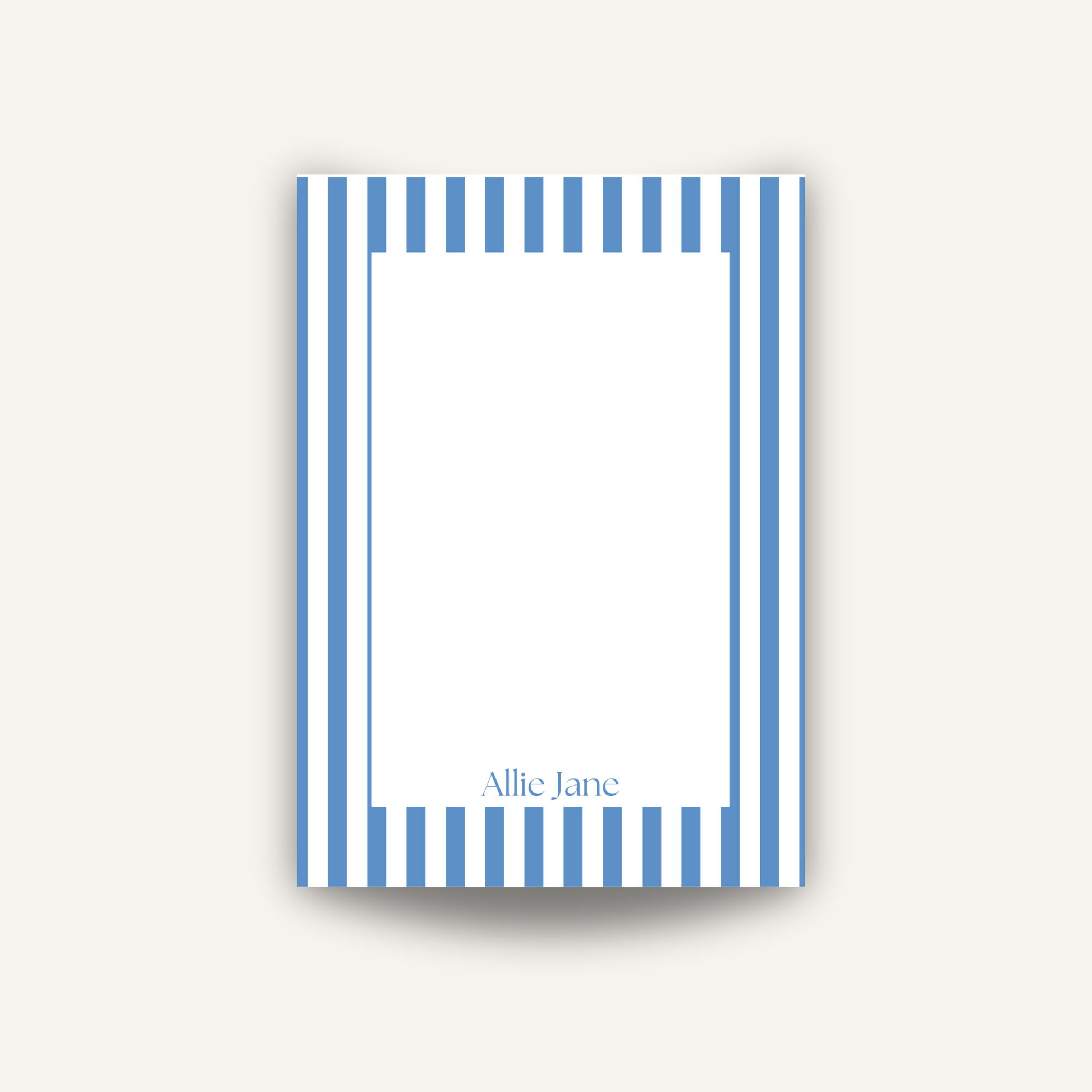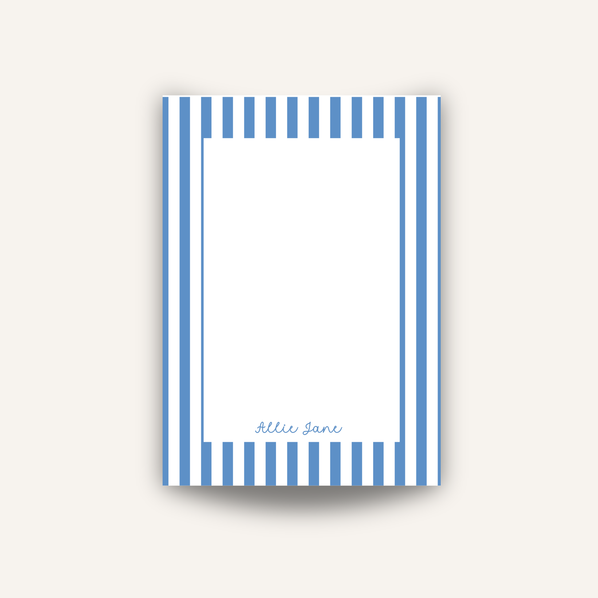 Classic, crisp, and effortlessly chic, this 50 page notepad features a timeless blue cabana stripe border that adds a touch of charm to your everyday notes. Perfect for lists, reminders, or love notes on y our desk or kitchen counter.